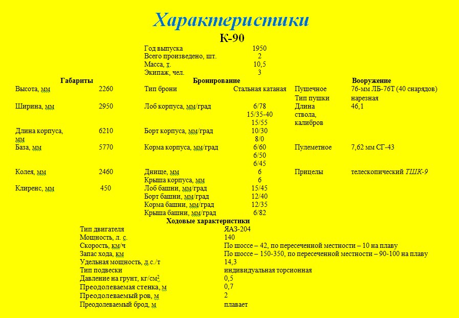 К-90 - советский опытный лёгкий плавающий танк, созданный в конце 1940-х - начале 1950-х годов. Был разработан ОКБ Сухопутных войск в 1949-1950 годах в рамках программы по созданию нового лёгкого разведывательного танка. К-90 основывался на агрегатах гусеничного артиллерийского тягача М-2 и грузового автомобиля МАЗ-200 и использовал традиционную схему с гребными винтами в качестве водоходного движителя, будучи разработан как альтернатива танку ПТ-76, на случай неудачи с созданием водомётного движителя для последнего. Параллельно с танком был разработан и плавающий бронетранспортёр К-78 на его базе. Два опытных образца К-90 были изготовлены в 1950 году и один из них в июле того же года прошёл сравнительные испытания с ПТ-76, по итогам которых на вооружение был принят последний, а дальнейшие работы по К-90 и К-78 прекращены.