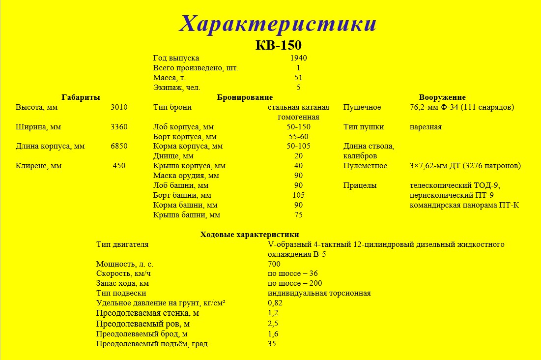 КВ-150 отличался от базовой модели (КВ-1) усиленным бронированием, командирской башенкой с тремя устройствами наблюдения (перископический прицел ПТ-9, телескопический – ТОД-9, командирская панорама ПТ-К), измененными кронштейнами ходовой части, двигателем В-5 (форсированный В-2), мощностью 700 л.с. Следствием этого стало возрастание массы танка до 50 тонн.