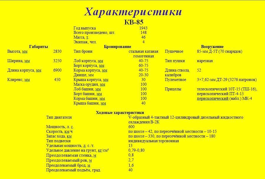 КВ-85 (Объект 239) – советский тяжёлый танк периода Великой Отечественной войны. Аббревиатура КВ означает «Клим Ворошилов» – официальное название серийных советских тяжёлых танков выпуска 1940-1943 гг. Индекс 85 означает калибр основного вооружения машины.