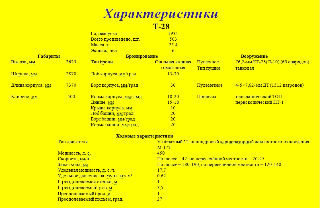 В средней (главной) башне опытного Т-28 была установлена 45-мм пушка и пулемет ДТ в шаровой установке; в двух малых башнях — еще два ДТ. Новый танк во многом отличался от иностранных аналогов, в частности, применением новейших технических новшеств. Так, для поворота массивной главной башни использовался электропривод, а для удобства работы экипажа в башне устанавливался подвесной полик. Своеобразная конструкция ходовой части танка, весившего 18 тонн, придавала ему необходимую плавность хода и обеспечивала преодоление довольно сложных препятствий. Однако при первом же испытании опытных образцов выявилось большое количество недоработок, как в ходовой части, так и в силовой установке.
