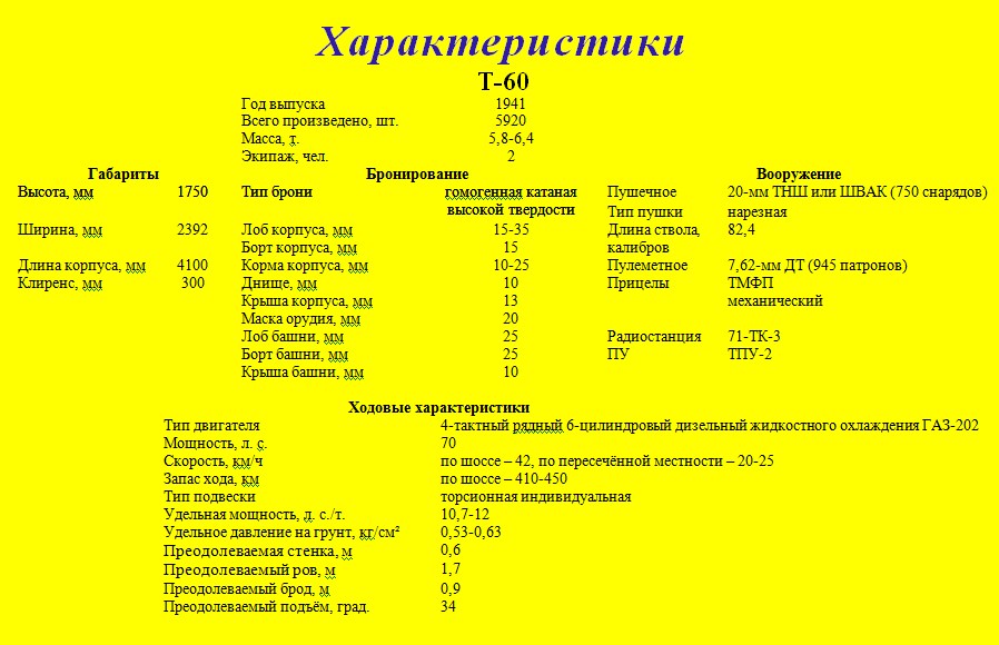 Т-60 – советский лёгкий танк периода Второй мировой войны, разработан в августе 1941 года на московском заводе № 37 под руководством Николая Александровича Астрова, ведущего разработчика всей отечественной линейки лёгких танков того периода. В сентябре того же года Т-60 был принят на вооружение Рабоче-Крестьянской Красной армии и серийно выпускался на нескольких машиностроительных заводах. Производство Т-60 продолжалось до февраля 1943 года, когда он был заменён на сборочных линиях более мощным лёгким танком Т-70. Всего было выпущено 5920 лёгких танков Т-60, которые приняли активное участие в боях Великой Отечественной войны в 1941-1943 годах. Небольшое число уцелевших в боях Т-60 использовалось как танки-разведчики, тягачи, учебные машины вплоть до конца войны. На базе Т-60 в 1941 году была построена первая самоходная установка БМ-8-24 класса реактивных систем залпового огня на танковом шасси. Вскоре после окончания войны Т-60 был снят с вооружения Советской армии, до настоящего времени сохранилось шесть подобных танков в музеях России и Финляндии.