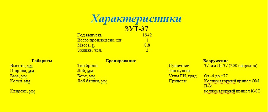 ЗУТ-37 (Зенитная Установка Танковая калибра 37 мм) – Зенитная самоходная установка Второй мировой войны с 37-мм пушкой Ш-37 на базе танка Т-70. Опытный образец был изготовлен летом 1942 года под руководством Н.А.Попова в КБ завода №37. В отличие от оригинального Т-70, вооруженного в качестве основного орудия 45-мм пушкой 20К, ЗУТ-37 была оснащена 37-мм автоматической пушкой Ш-37 конструкции Б.Г.Шпитального и не имела пулемёта в качестве дополнительного вооружения. Начальная скорость снаряда у этой пушки составляла 1000 м/с и обладала возможностью ведения огня по воздушным целям. Конструкция автоматики пушки была основана на принципе отвода газов из канала ствола. УВН-ы (углы вертикальной наводки) составляли от -4 до +77°.